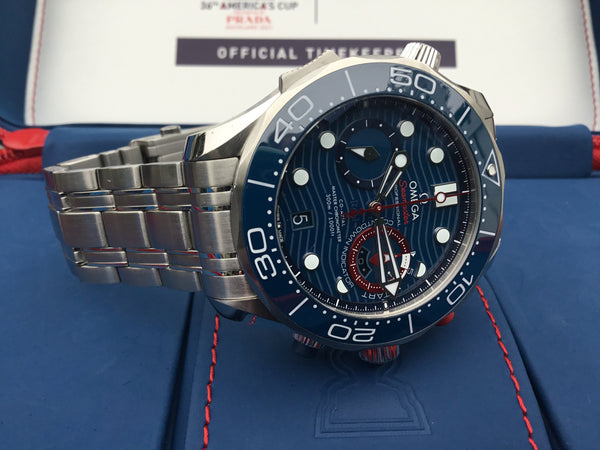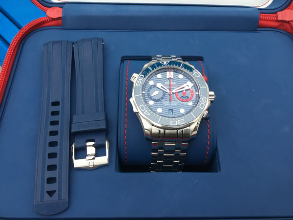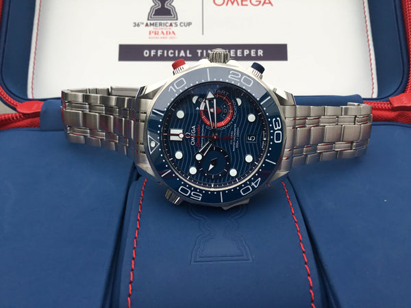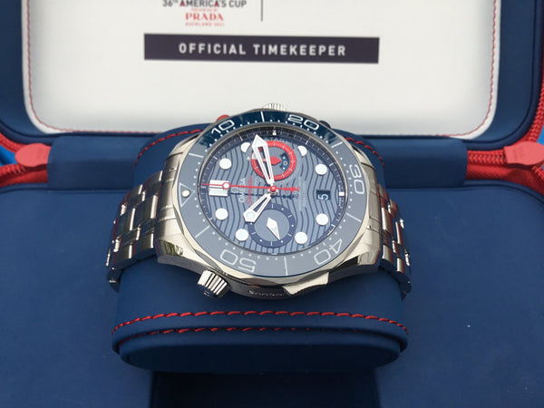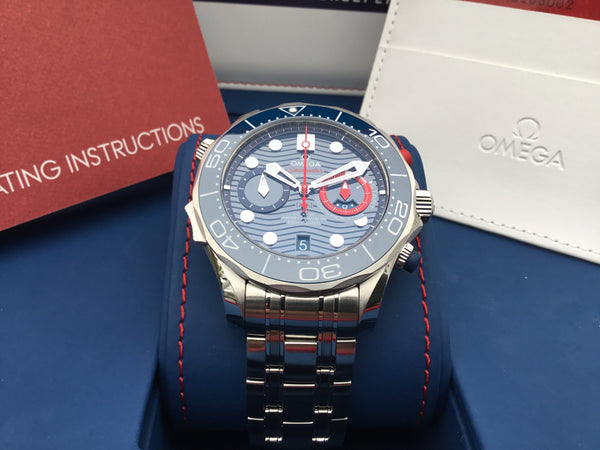 A bold and distinctive timepiece, the Omega Seamaster Diver 300M Master Co-Axial 44 Chronograph America embodies the heritage and innovation of Omega’s iconic Seamaster line. Perfectly blending style, functionality, and precision, this limited-edition chronograph celebrates the adventurous spirit of Omega enthusiasts.