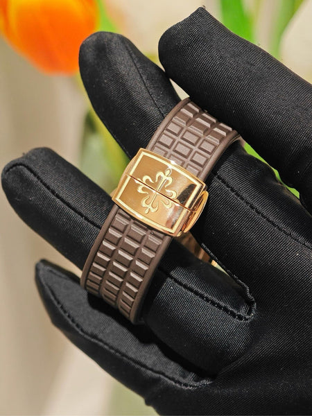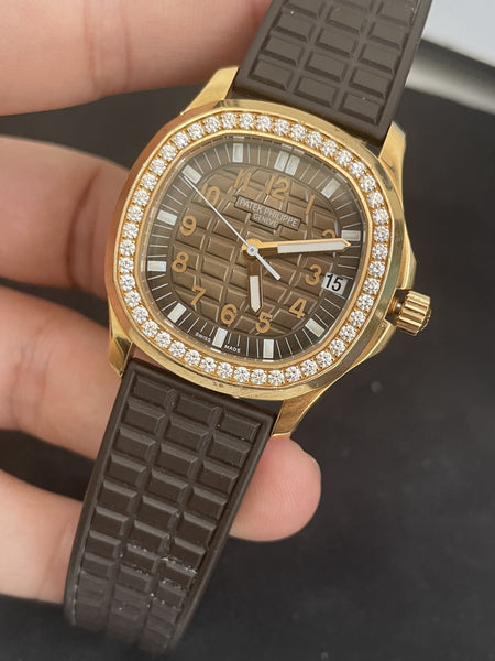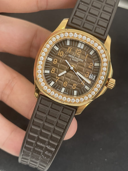 This Patek Philippe Aquanaut 5068R is in exceptional condition, showcasing its pristine rose gold case, sparkling diamond bezel, and flawless dial. The rubber strap and clasp are in excellent condition. Fully serviced and ready to elevate any collection.