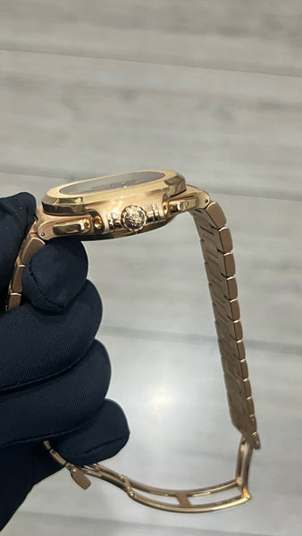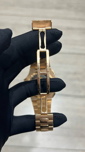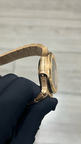 This Patek Philippe Nautilus 5980/1R is in pristine condition, showcasing a flawlessly maintained rose gold case, bracelet, and dial. Fully serviced and operating at peak performance, this timepiece is a true statement of elegance and functionality, ready for its next discerning owner.