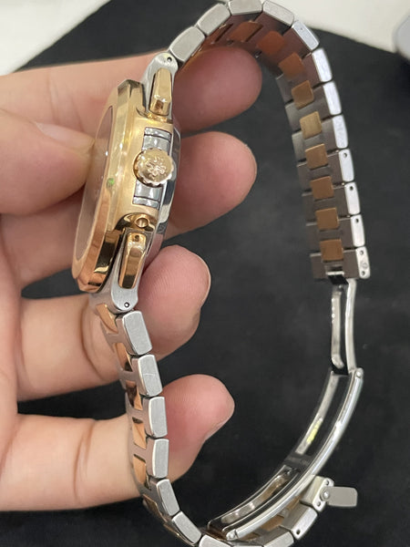 For sale is the luxurious and sporty Patek Philippe Nautilus Two-Tone Chronograph, reference 5980/1AR. Combining stainless steel and rose gold, this timepiece is a bold statement of sophistication and modern design, offering the versatility of a sports watch with the elegance of precious materials.